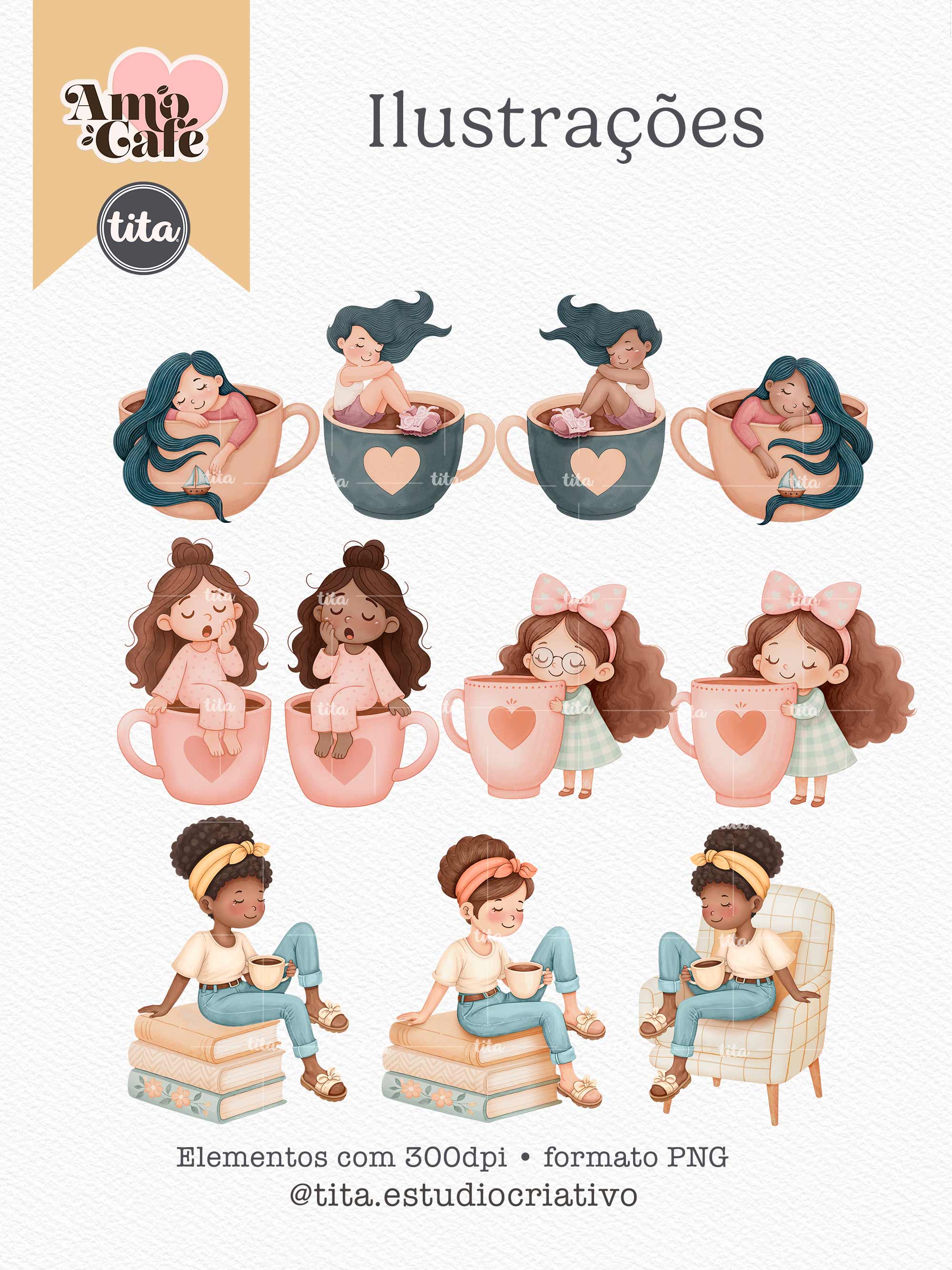 Amo Café - ilustrações contém imagens exclusivas que tornarão os seus projetos mais encantadores. Criados exclusivamente por Paty Greif para o Tita Estúdio Criativo. Arquivos com resolução 300dpi.