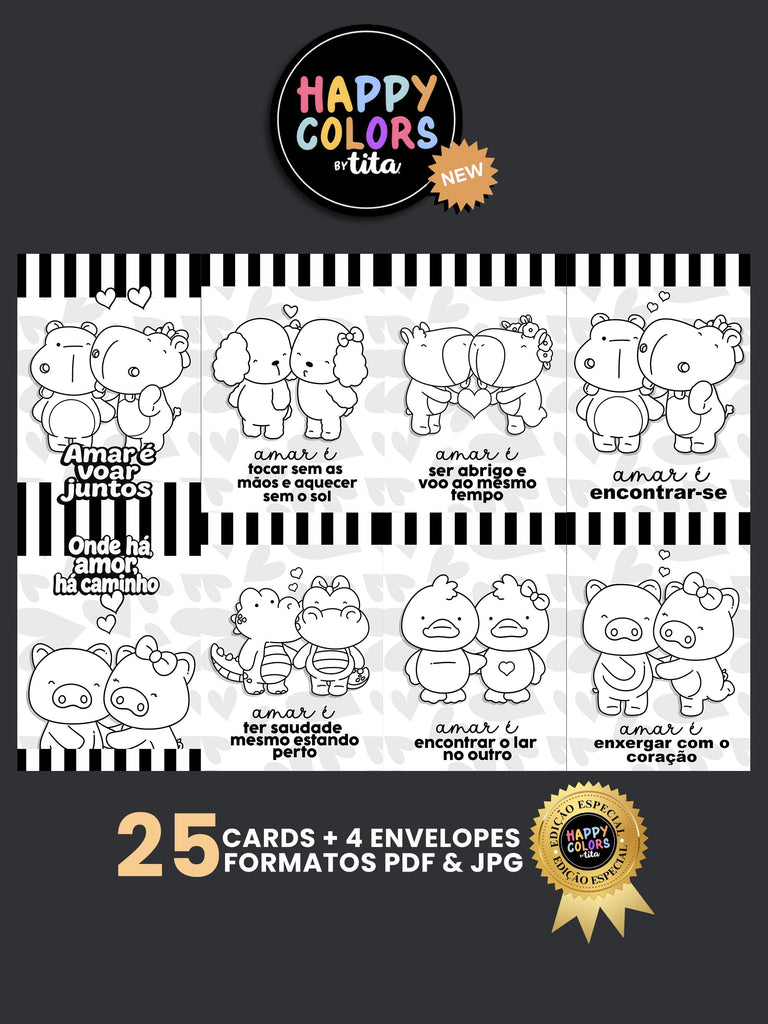 Happy Colors - Cards + Envelopes- Love Is In The Air contém imagens exclusivas que tornarão os seus projetos mais encantadores. Criados exclusivamente para o Tita Estúdio Criativo . Arquivos com resolução 300dpi.