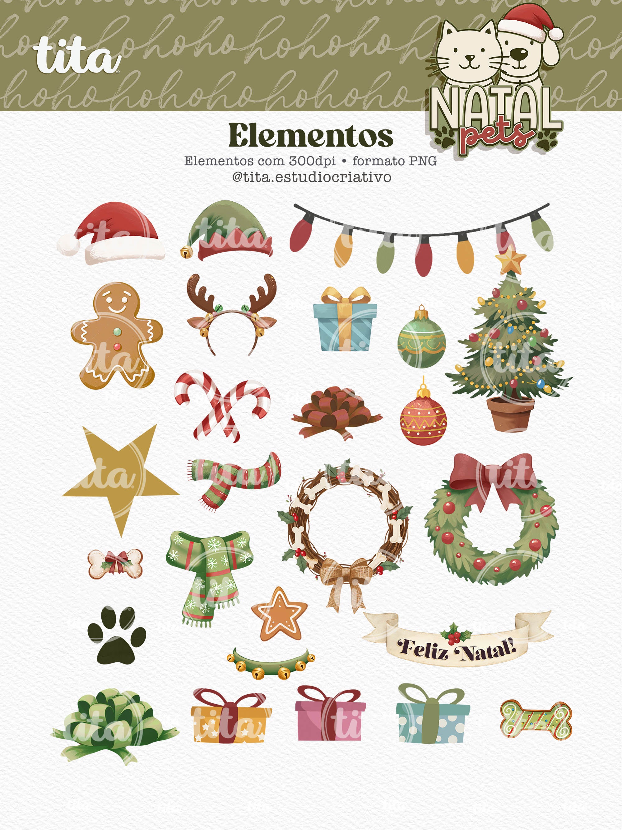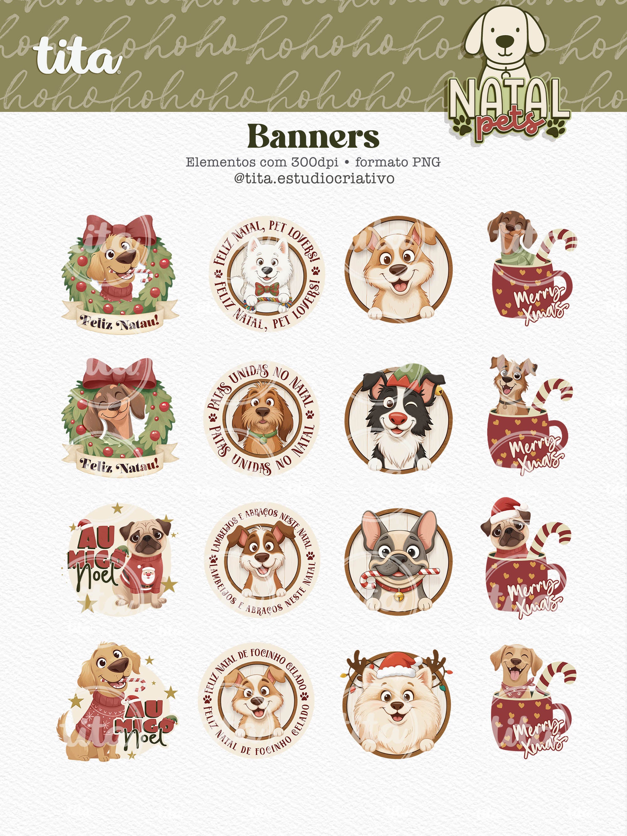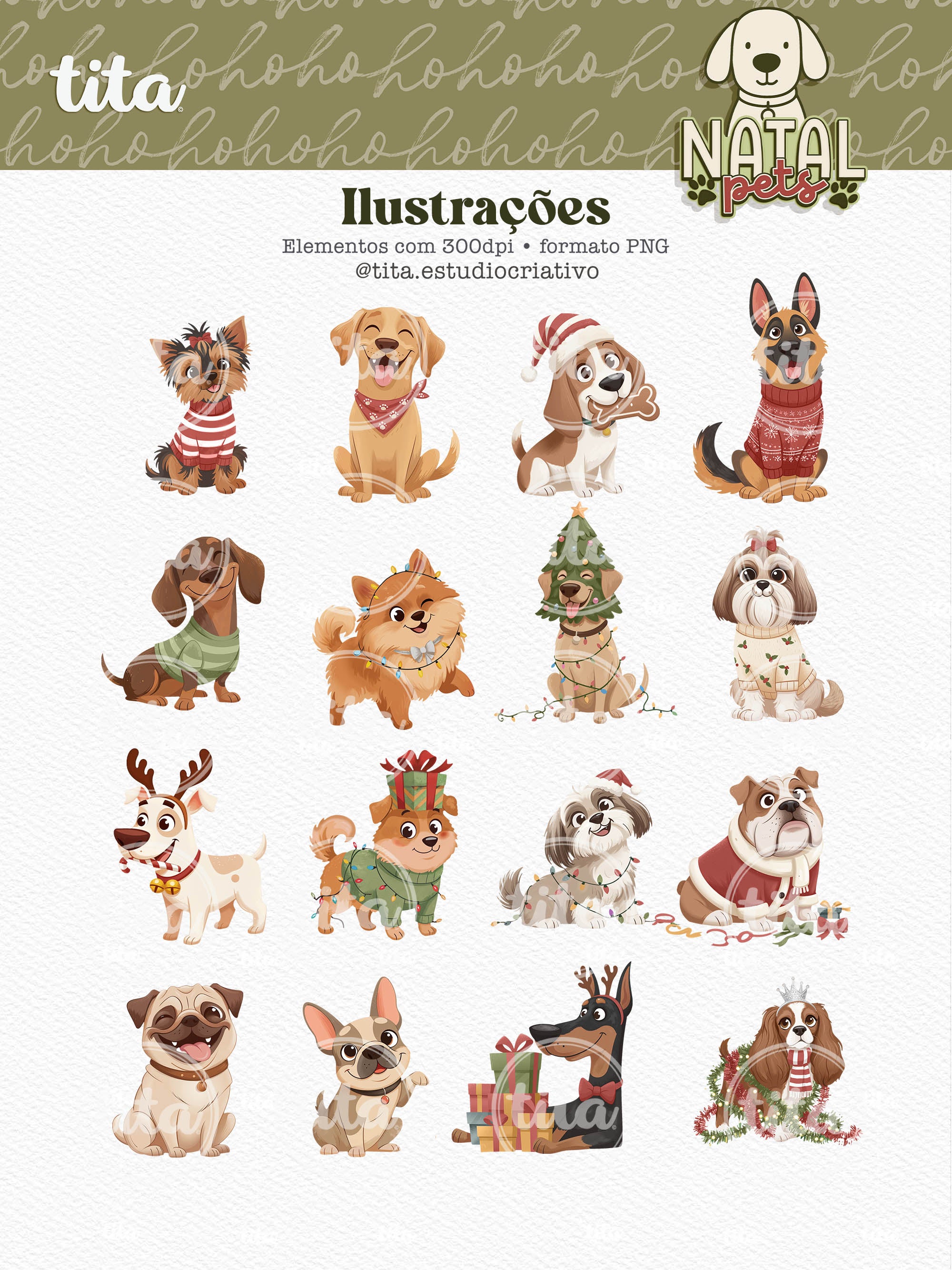 Natal Pets - Combo Ilustrações contém imagens exclusivas que tornarão os seus projetos mais encantadores. Criados exclusivamente para o Tita Estúdio Criativo . Arquivos com resolução 300dpi.