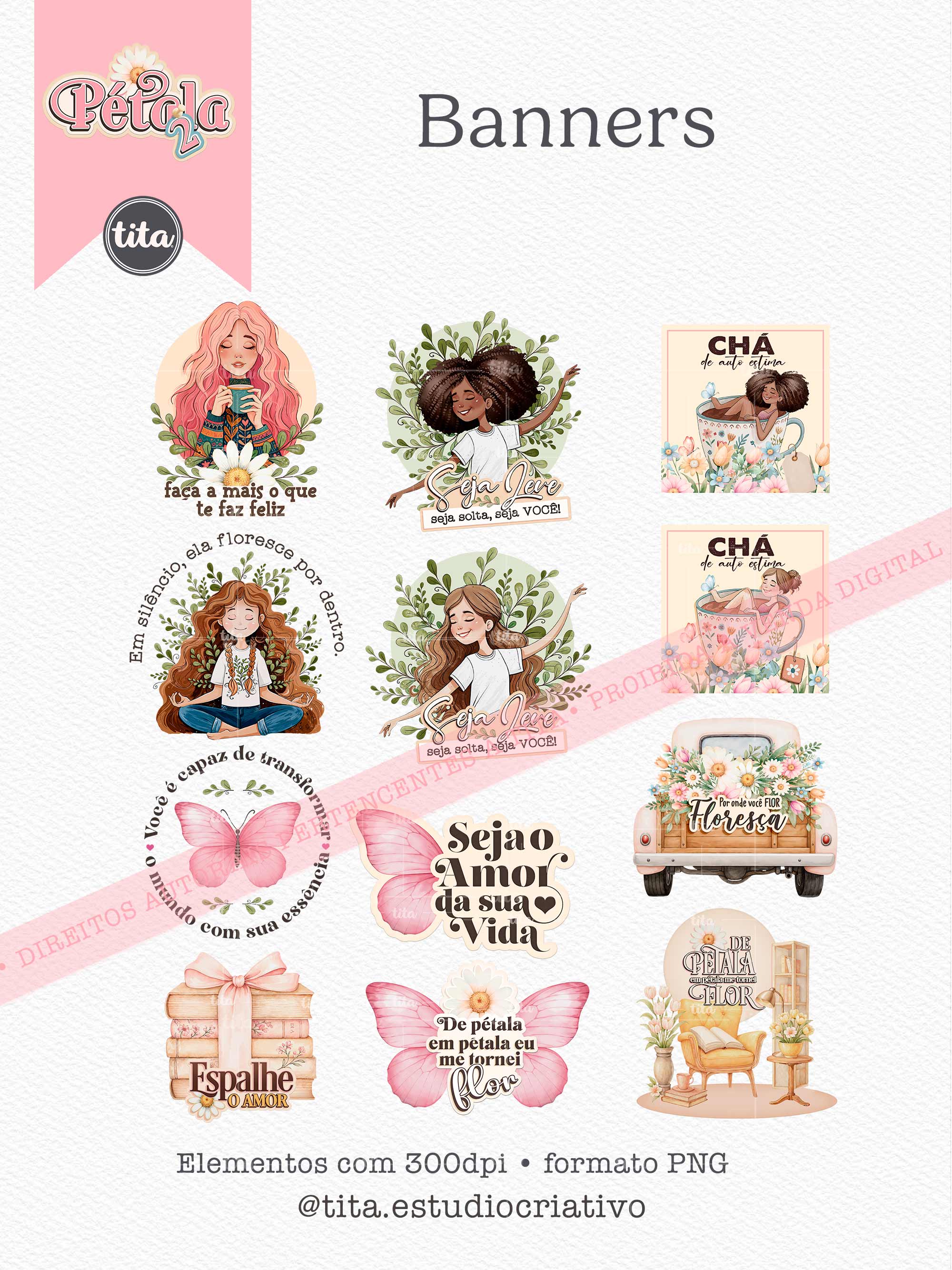 Pétala 2 - Banners contém imagens exclusivas que tornarão os seus projetos mais encantadores. Criados exclusivamente por Paty Greif para o Tita Estúdio Criativo. Arquivos com resolução 300dpi.