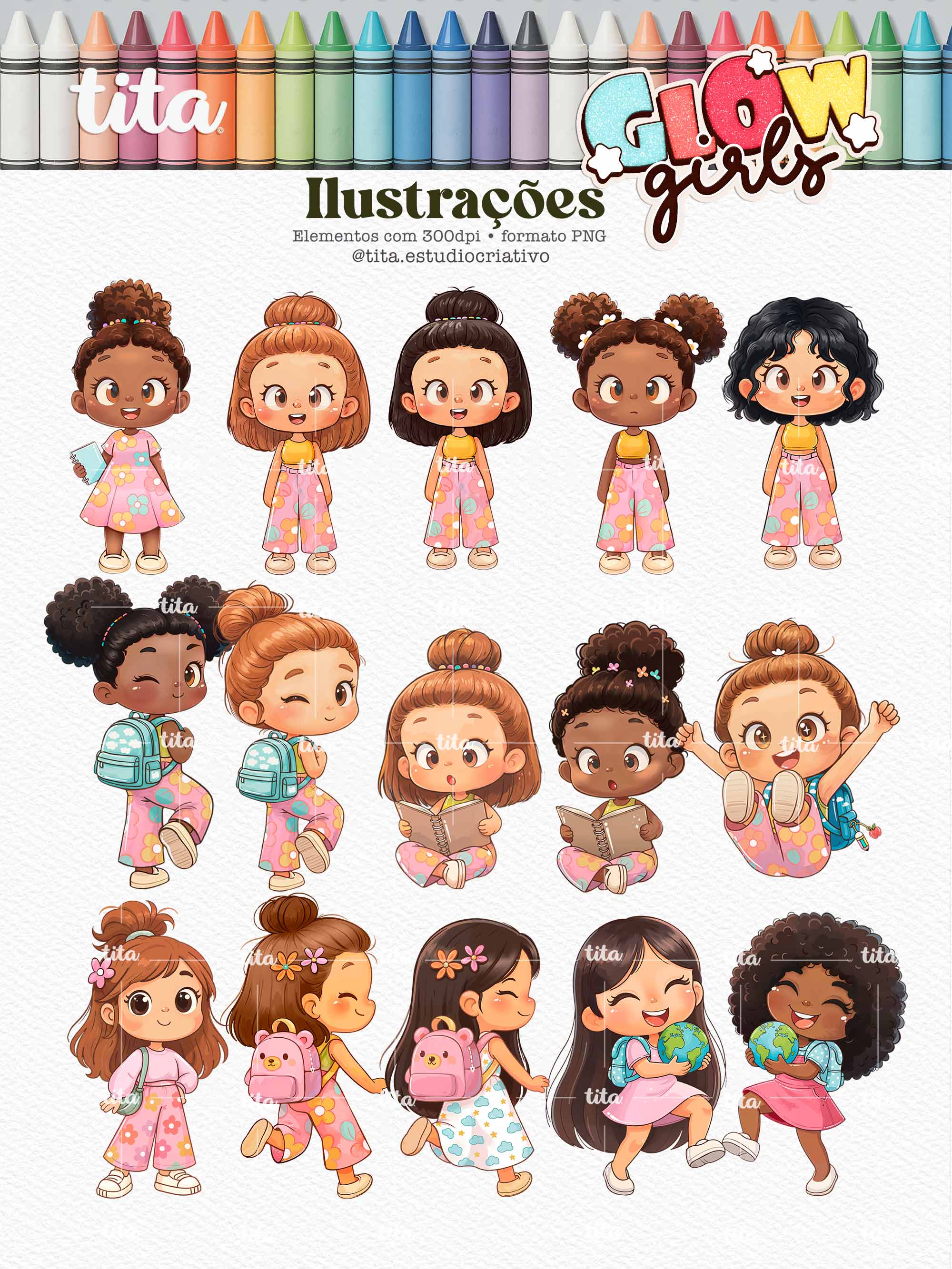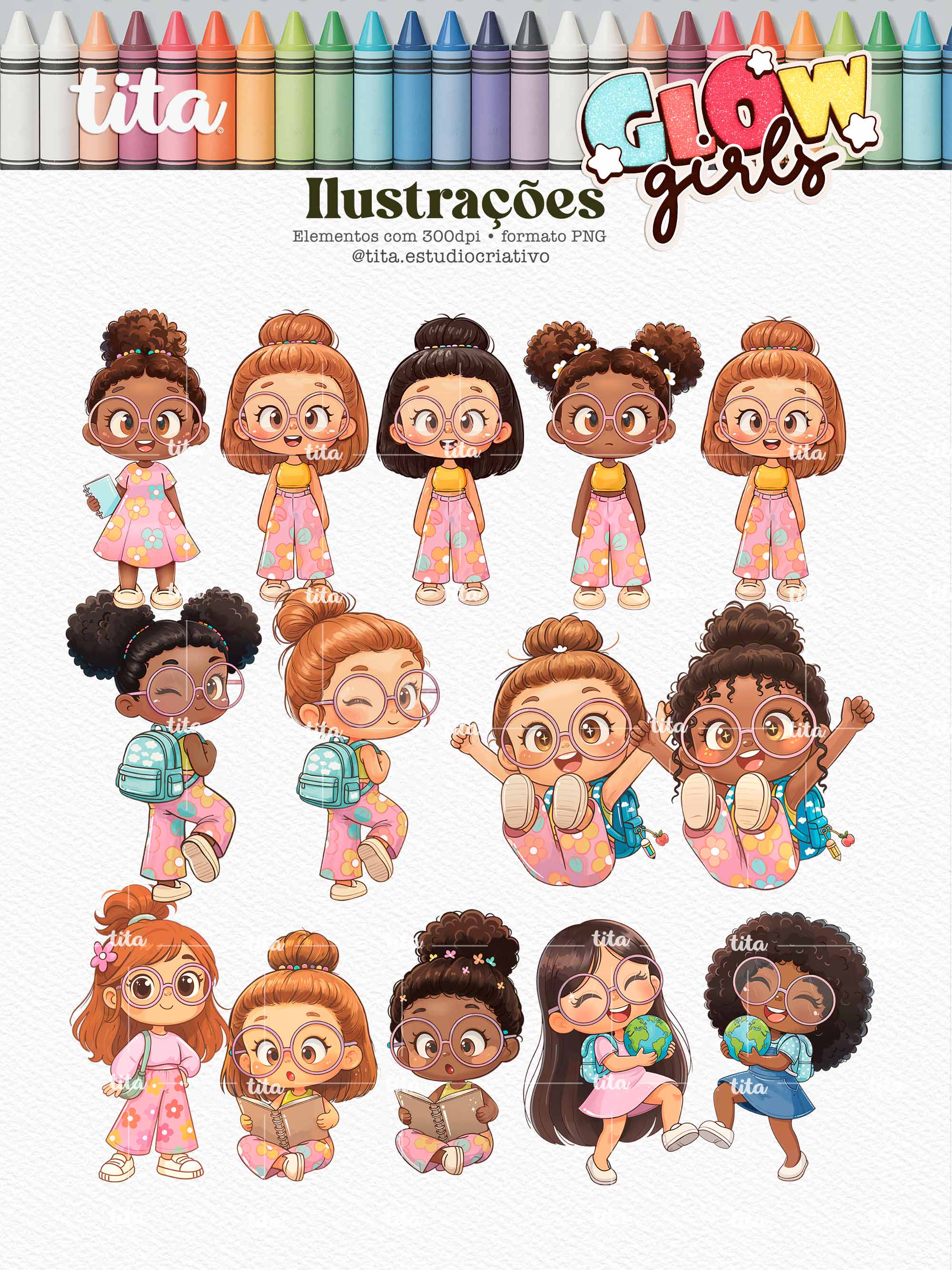Glow Girls - Ilustrações contém imagens exclusivas que tornarão os seus projetos mais encantadores. Criados exclusivamente para o Tita Estúdio Criativo . Arquivos com resolução 300dpi.