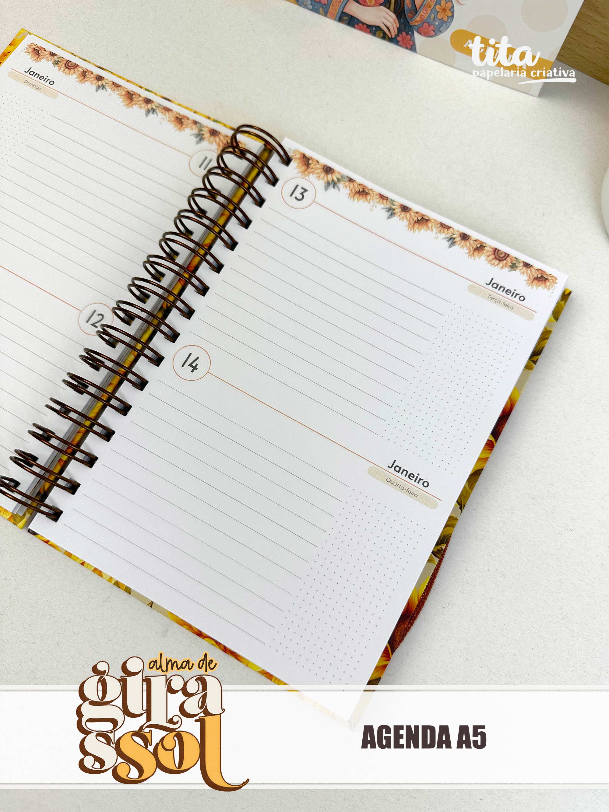 Agenda A5 Datada 2026 - miolo 1 e 2 dias por folha, marcadores, adesivos, bolsinho e várias opções de capa.