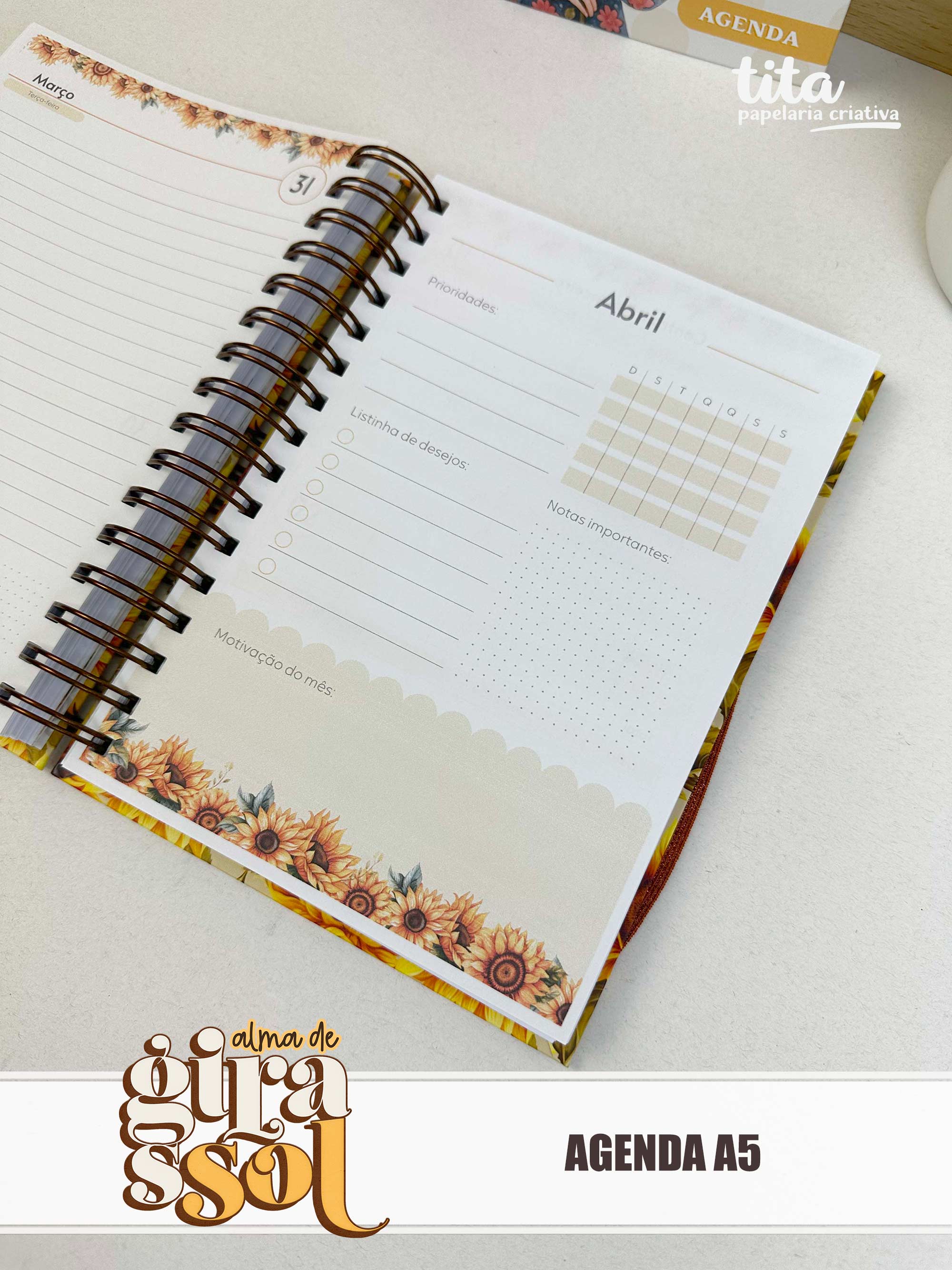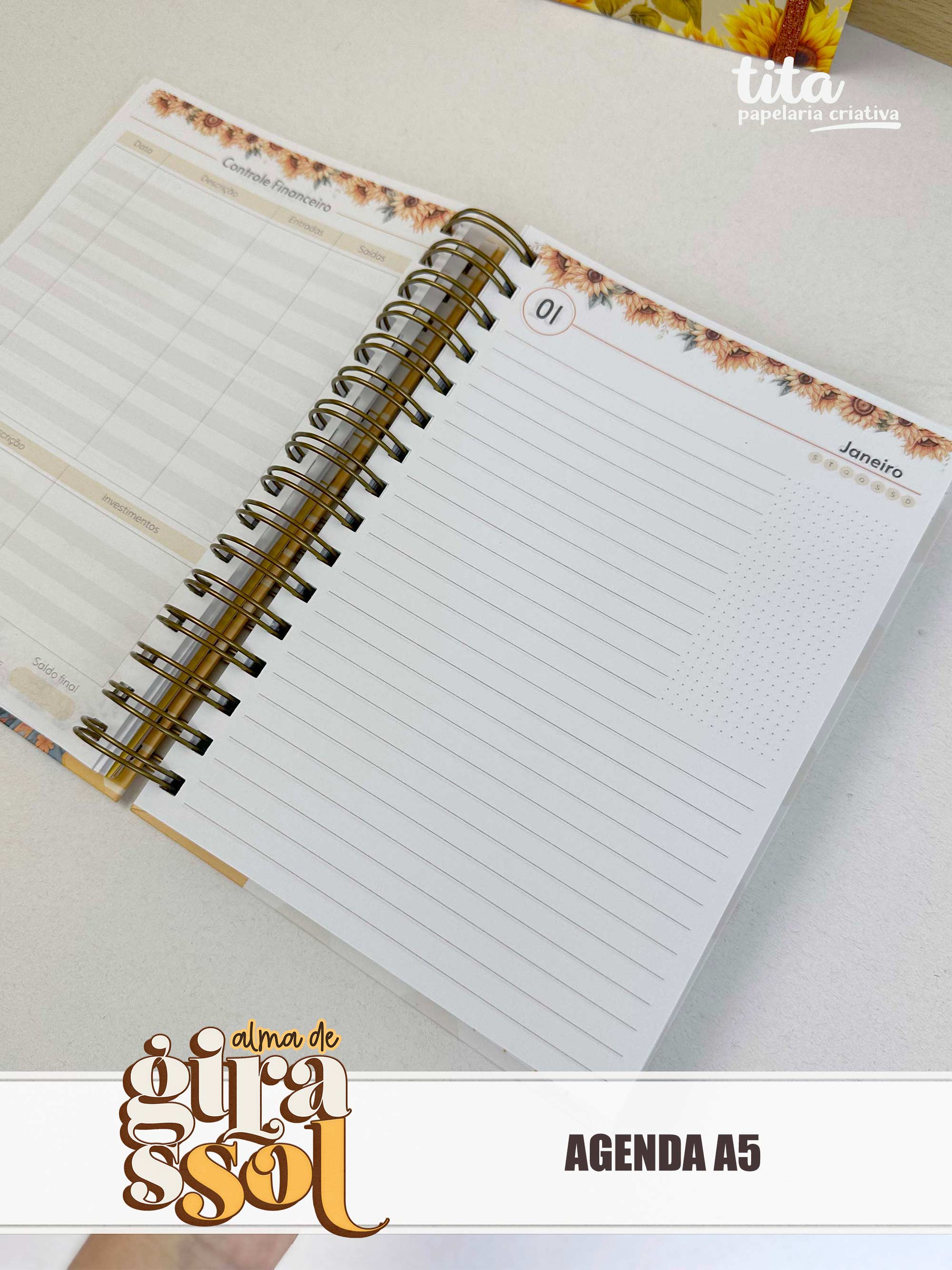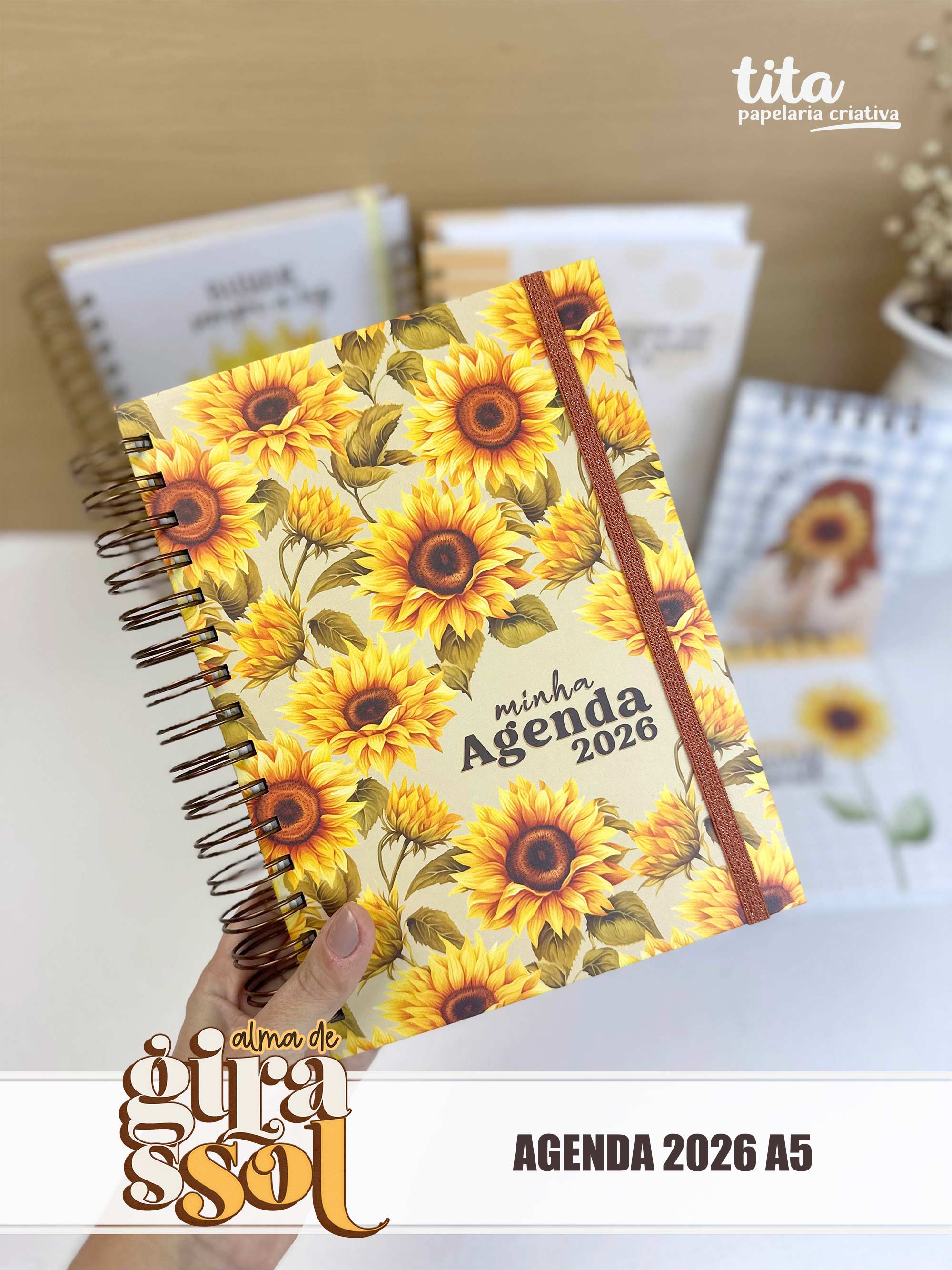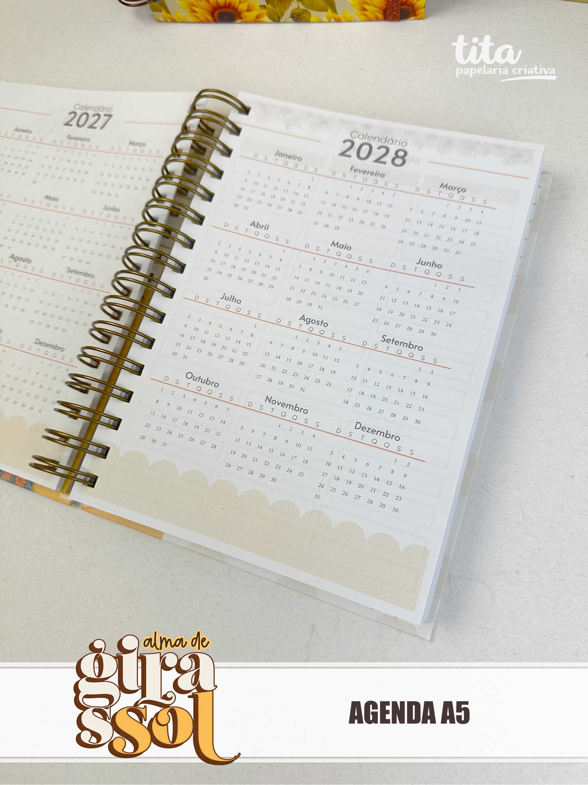 Agenda A5 Datada 2026 - miolo 1 e 2 dias por folha, marcadores, adesivos, bolsinho e várias opções de capa.