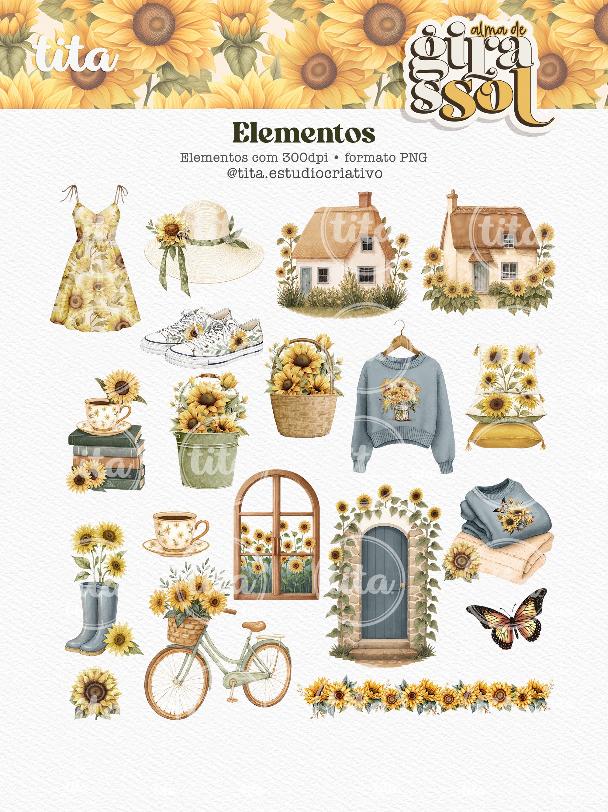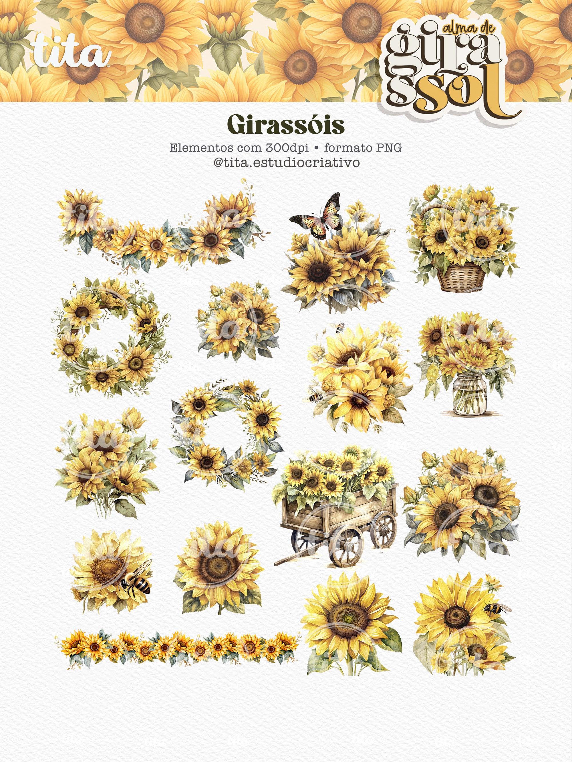 Alma de Girassol - Combo Ilustrações e Papéis contém imagens exclusivas que tornarão os seus projetos mais encantadores. Criados exclusivamente por Paty Greif para o Tita Estúdio Criativo . Arquivos com resolução 300dpi.