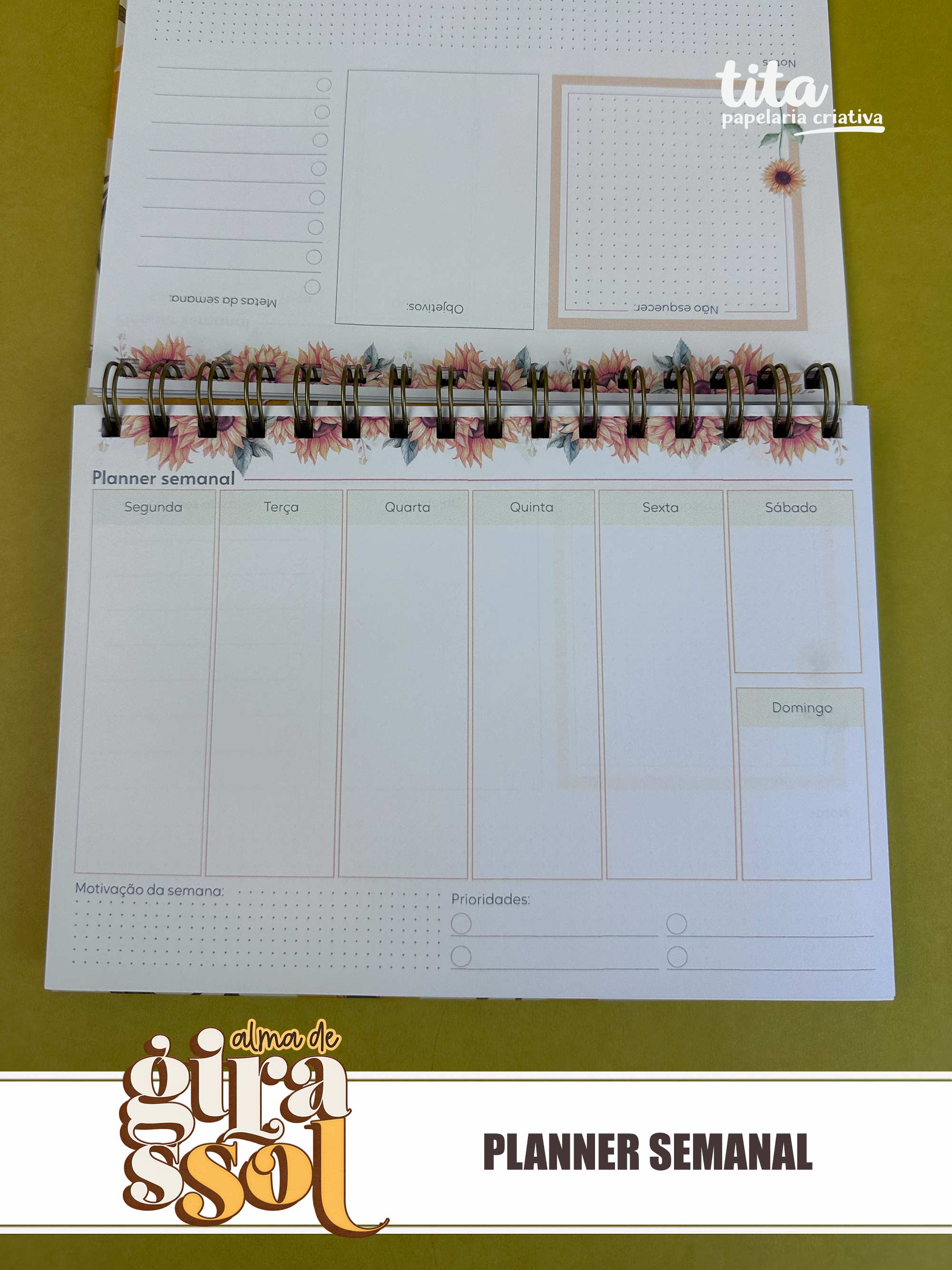 Alma de Girassol -Planner Semanal contém imagens exclusivas que tornarão os seus projetos mais encantadores. Criados exclusivamente por Paty Greif para o Tita Estúdio Criativo . Arquivos com resolução 300dpi.