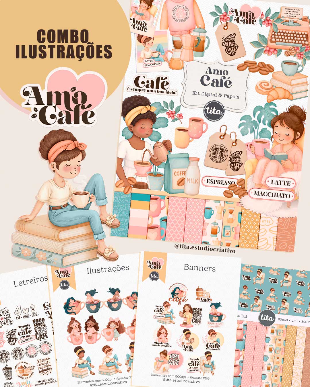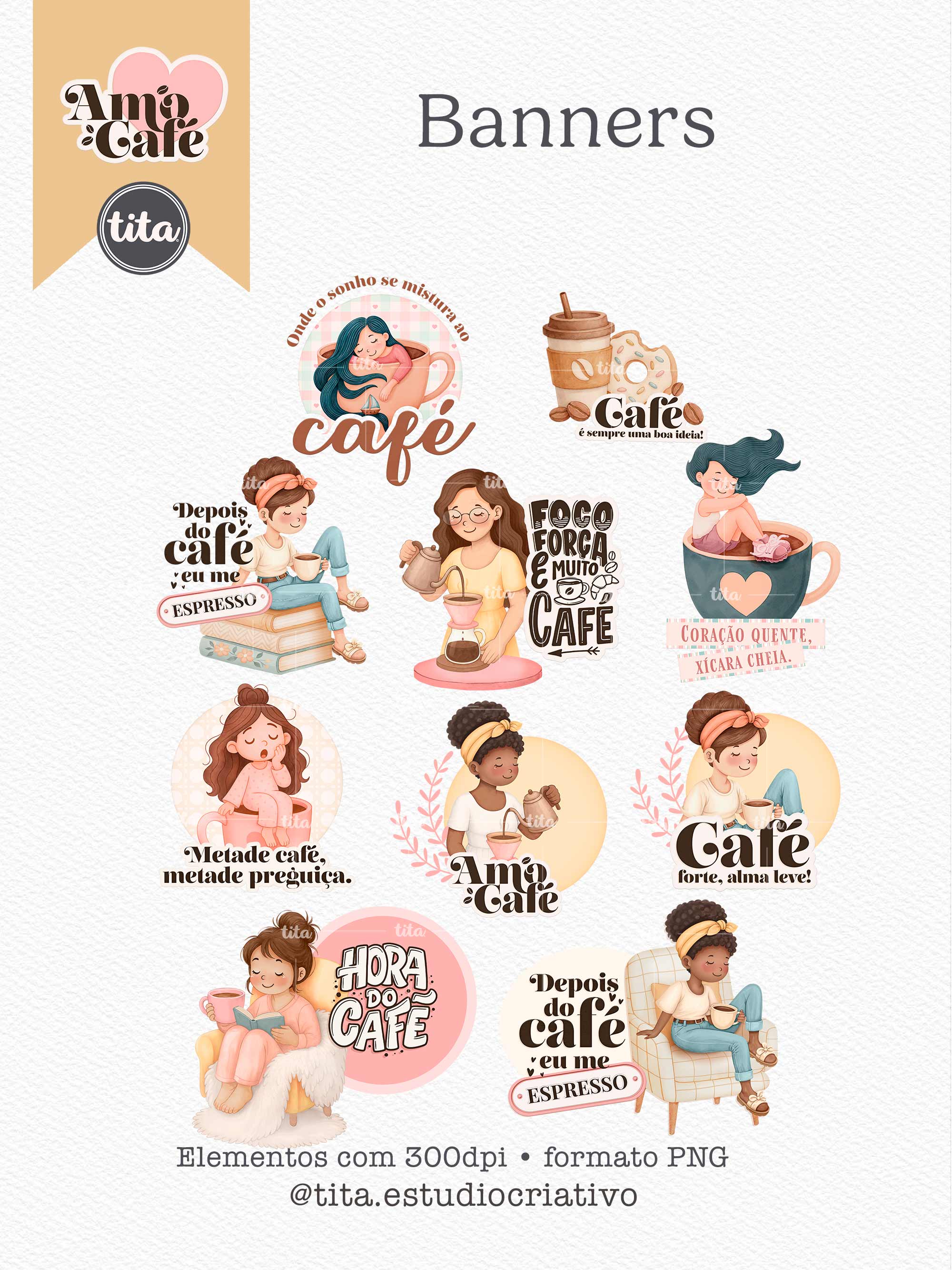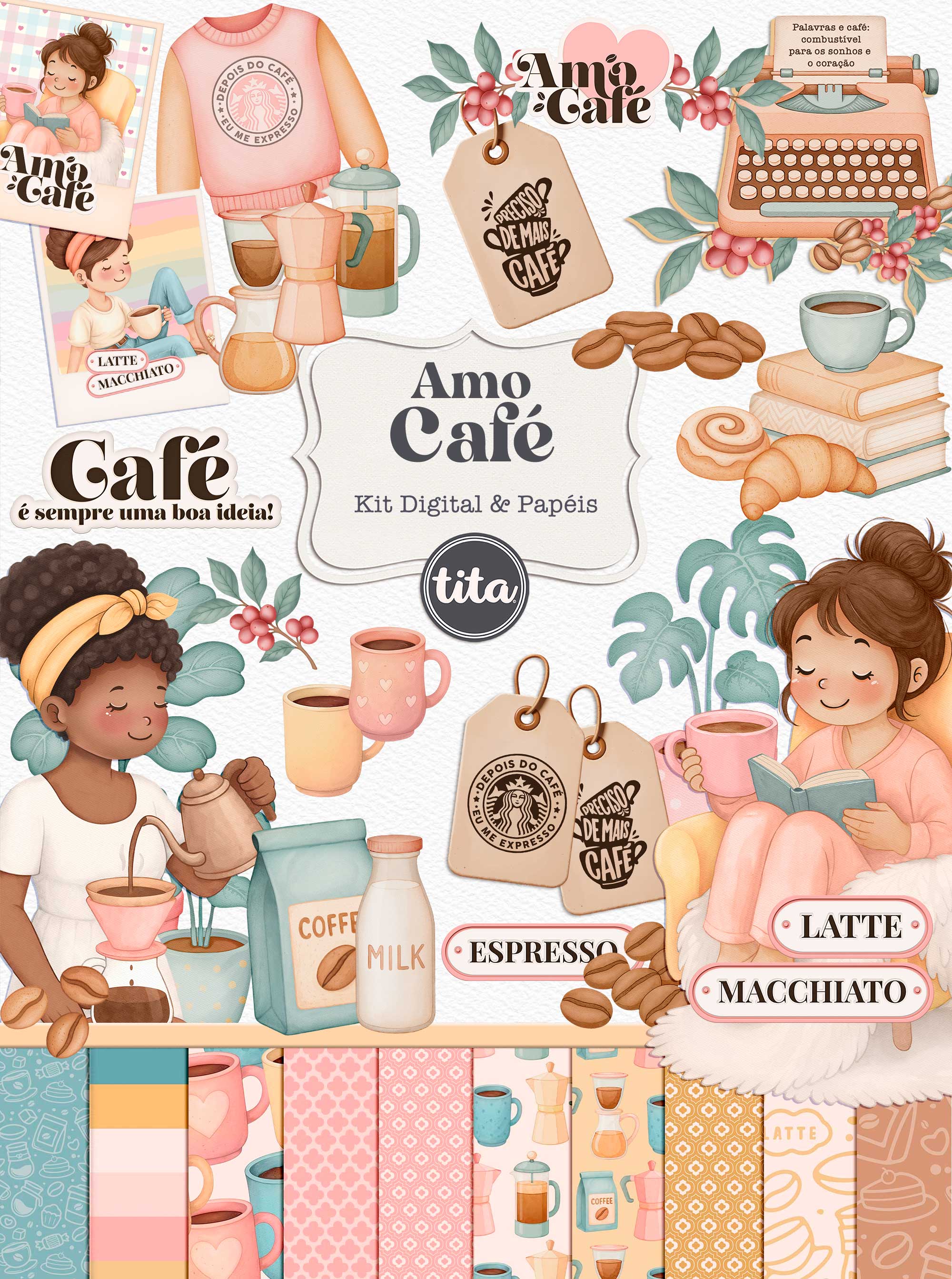 Amo Café - Combo Ilustrações e Papéis contém imagens exclusivas que tornarão os seus projetos mais encantadores. Criados exclusivamente por Paty Greif para o Tita Estúdio Criativo. Arquivos com resolução 300dpi.