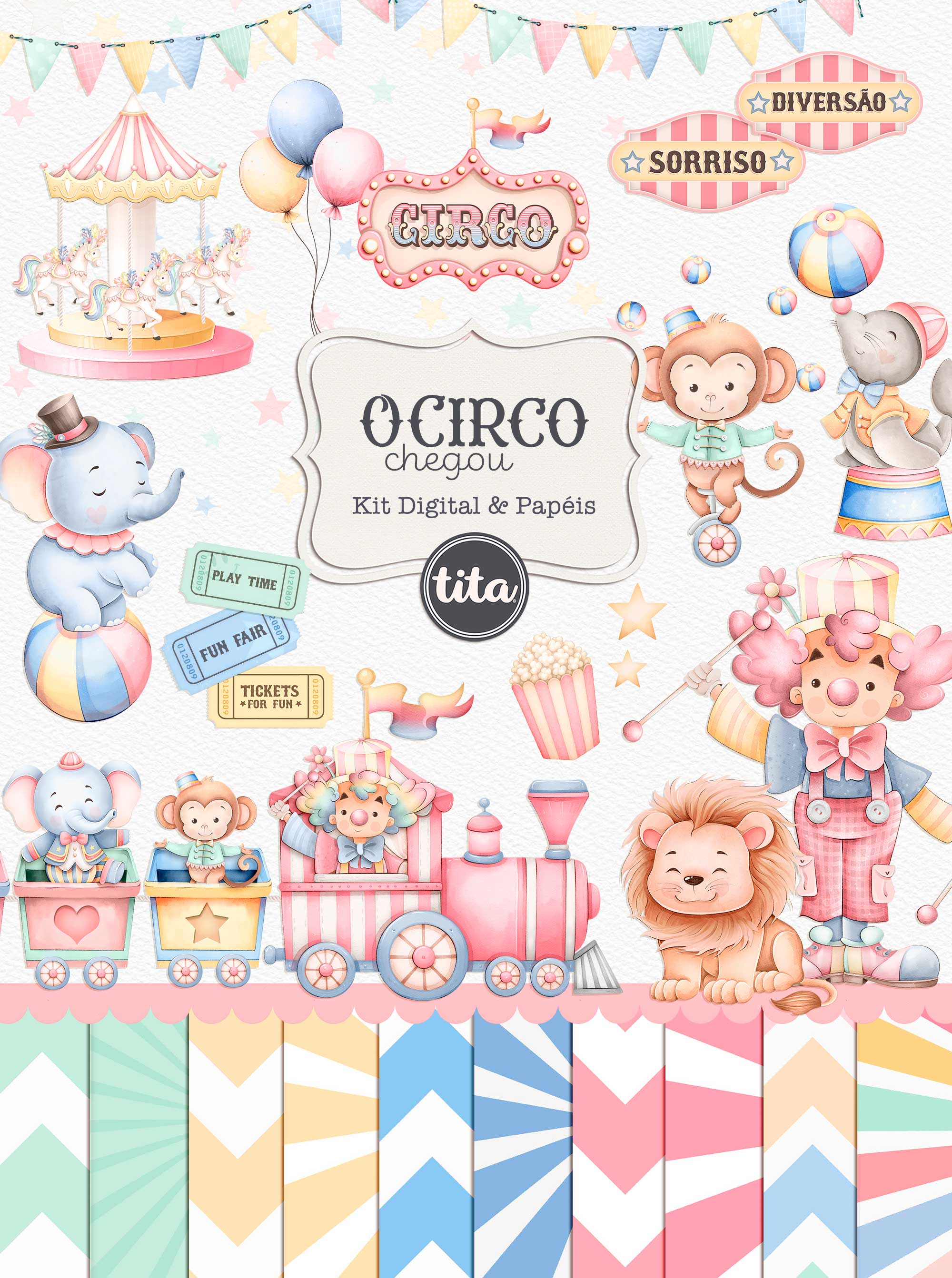 O Circo Chegou - Kit Digital contém imagens exclusivas que tornarão os seus projetos mais encantadores. Criados exclusivamente por Paty Greif para o Tita Estúdio Criativo. Arquivos com resolução 300dpi.