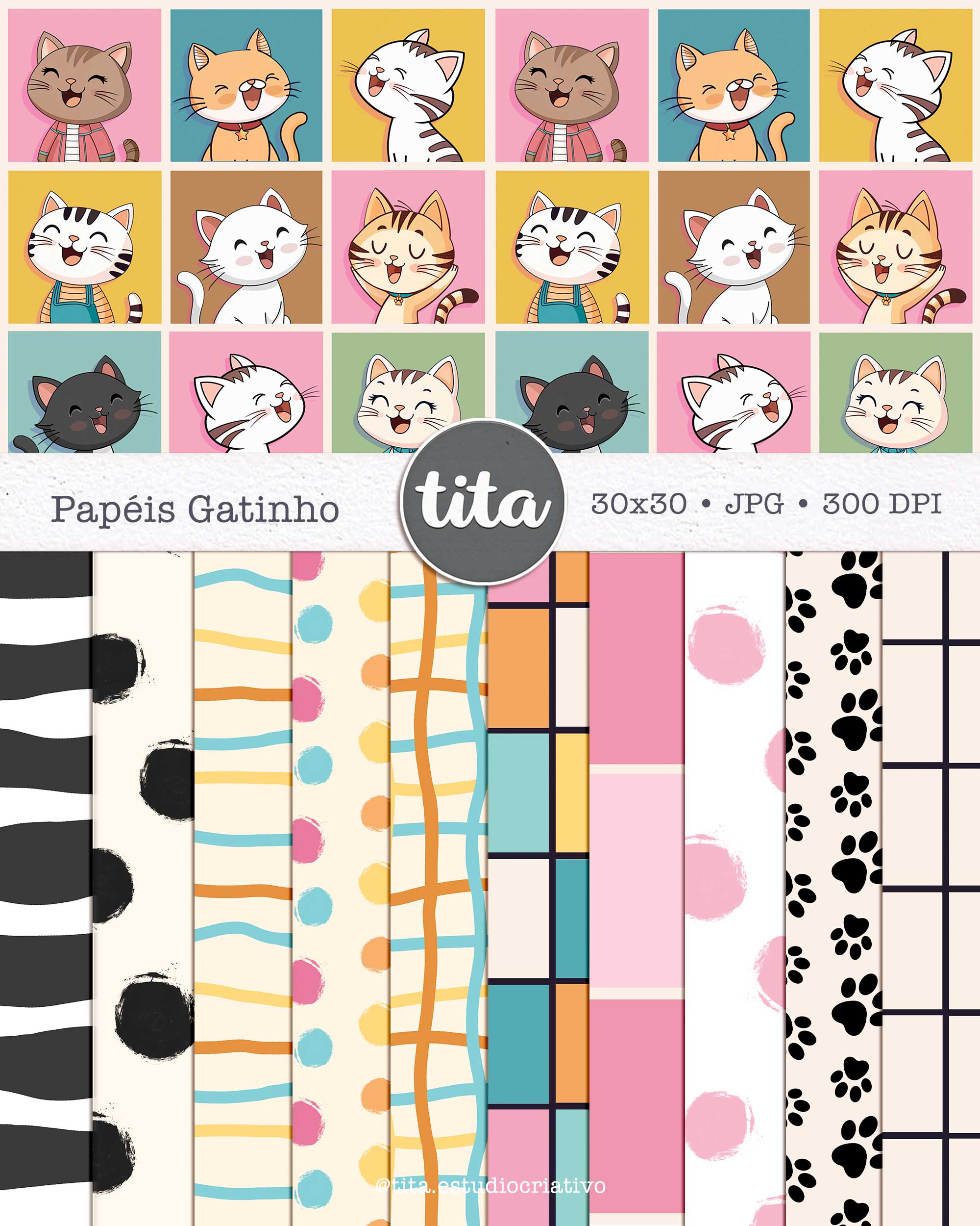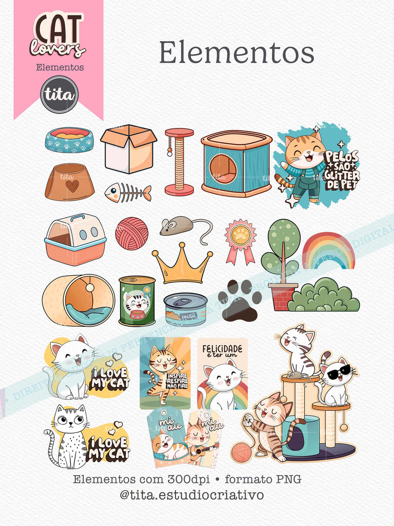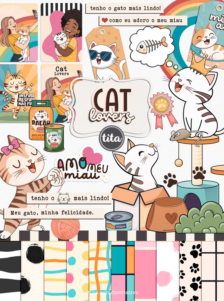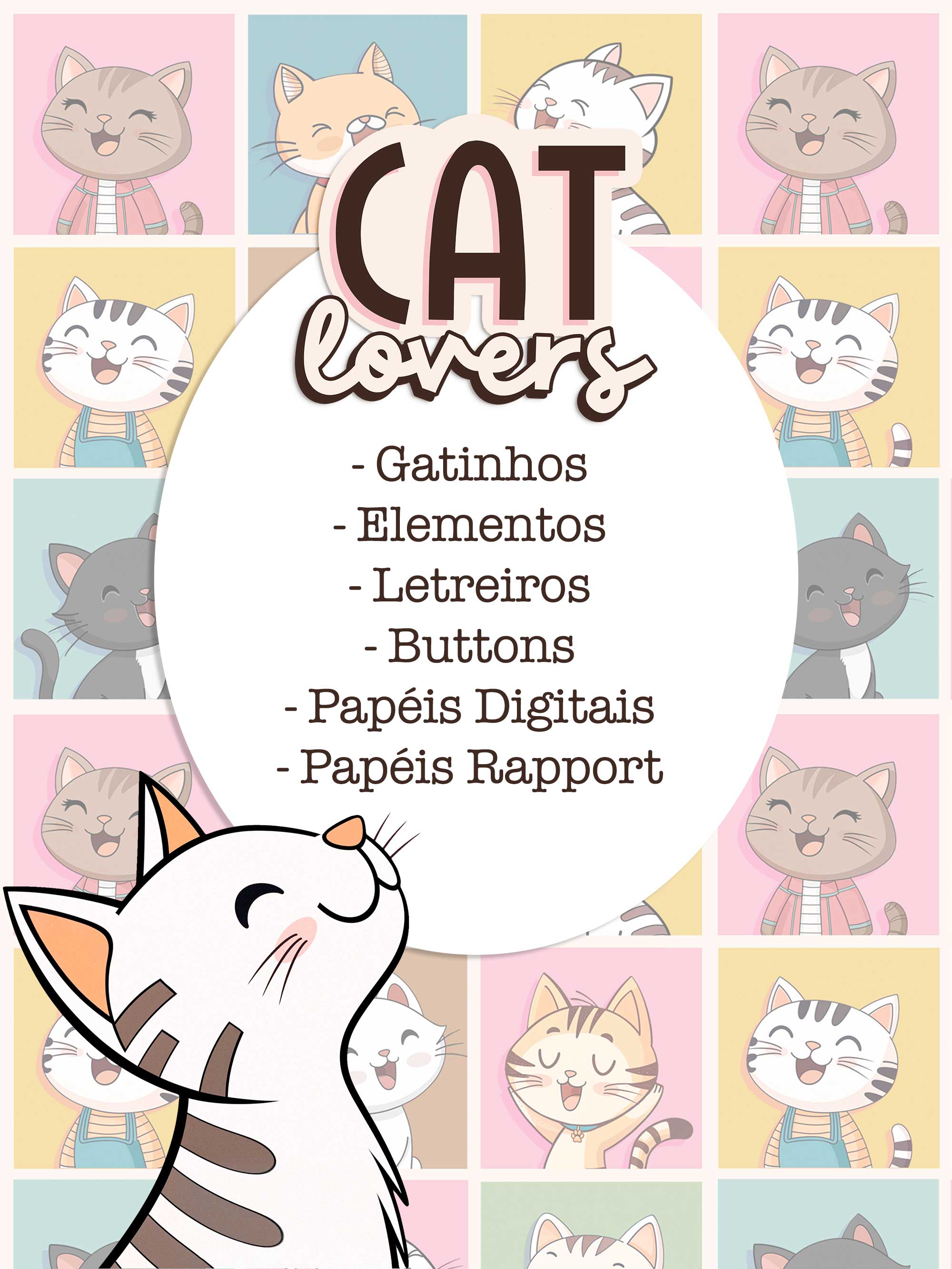 Pacote Gatos com: Gatinhos, Elementos, Letreiros, Buttons, Papéis Decor e Papéis Rapport