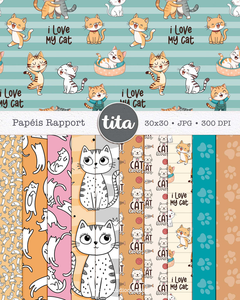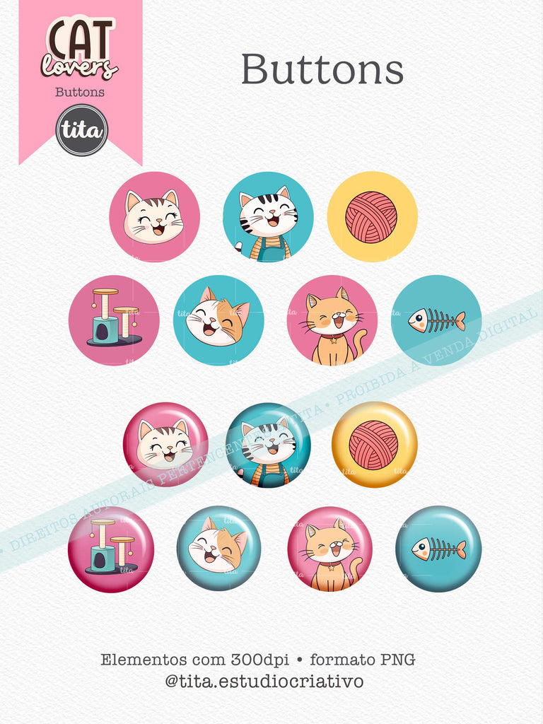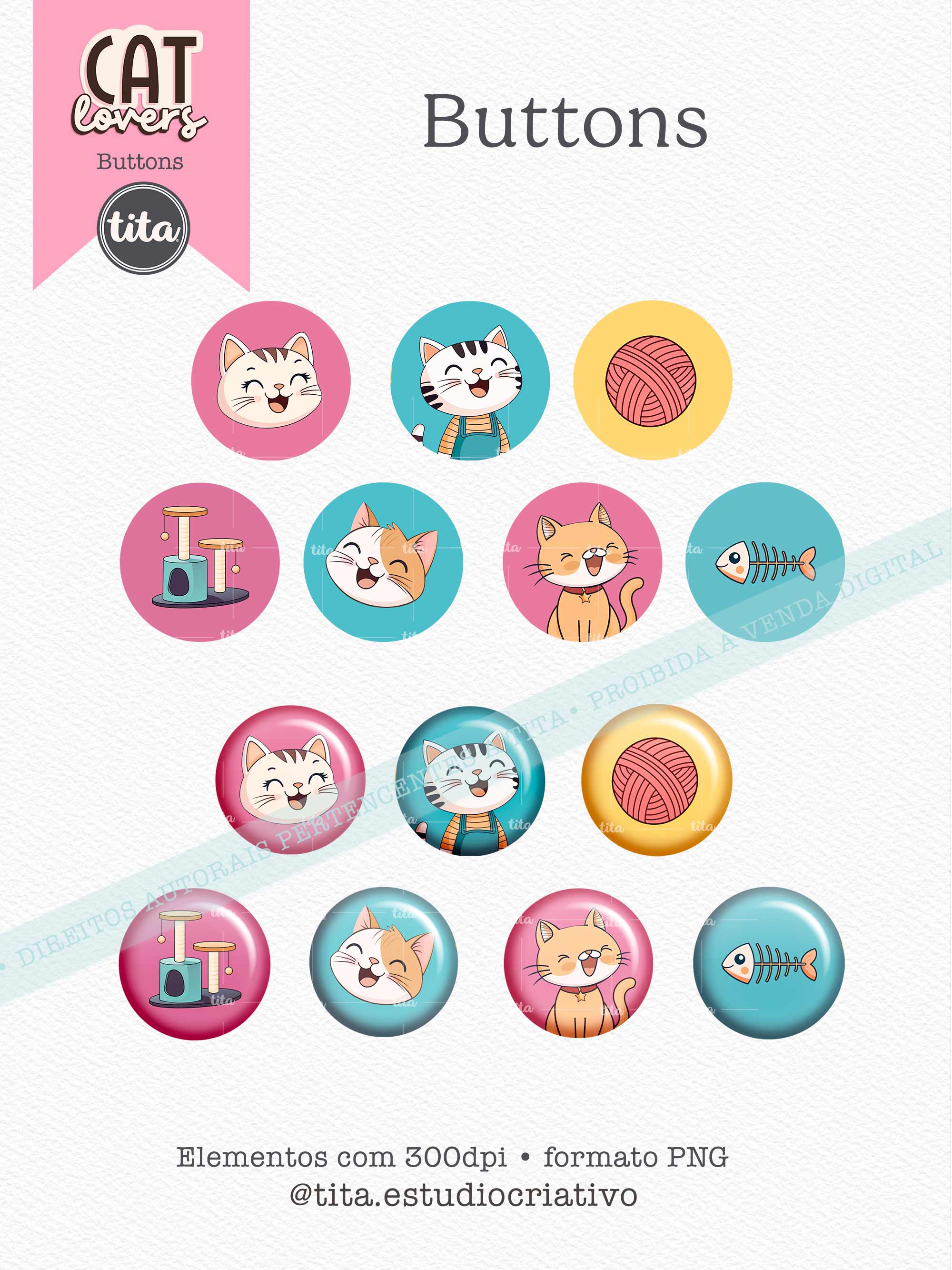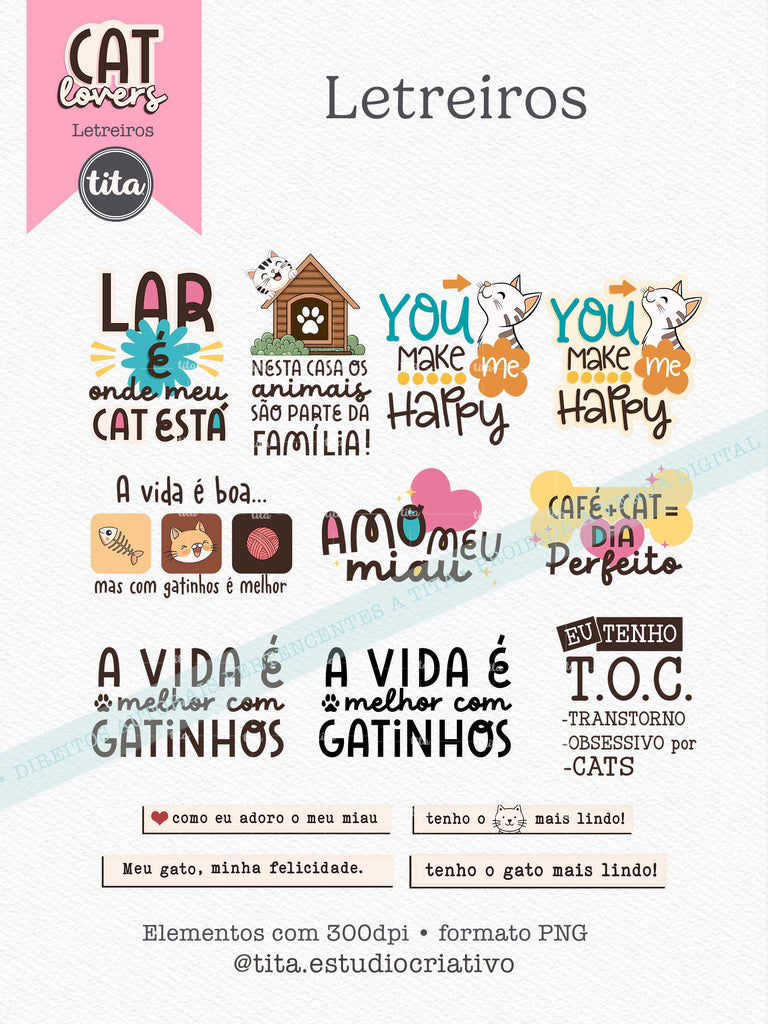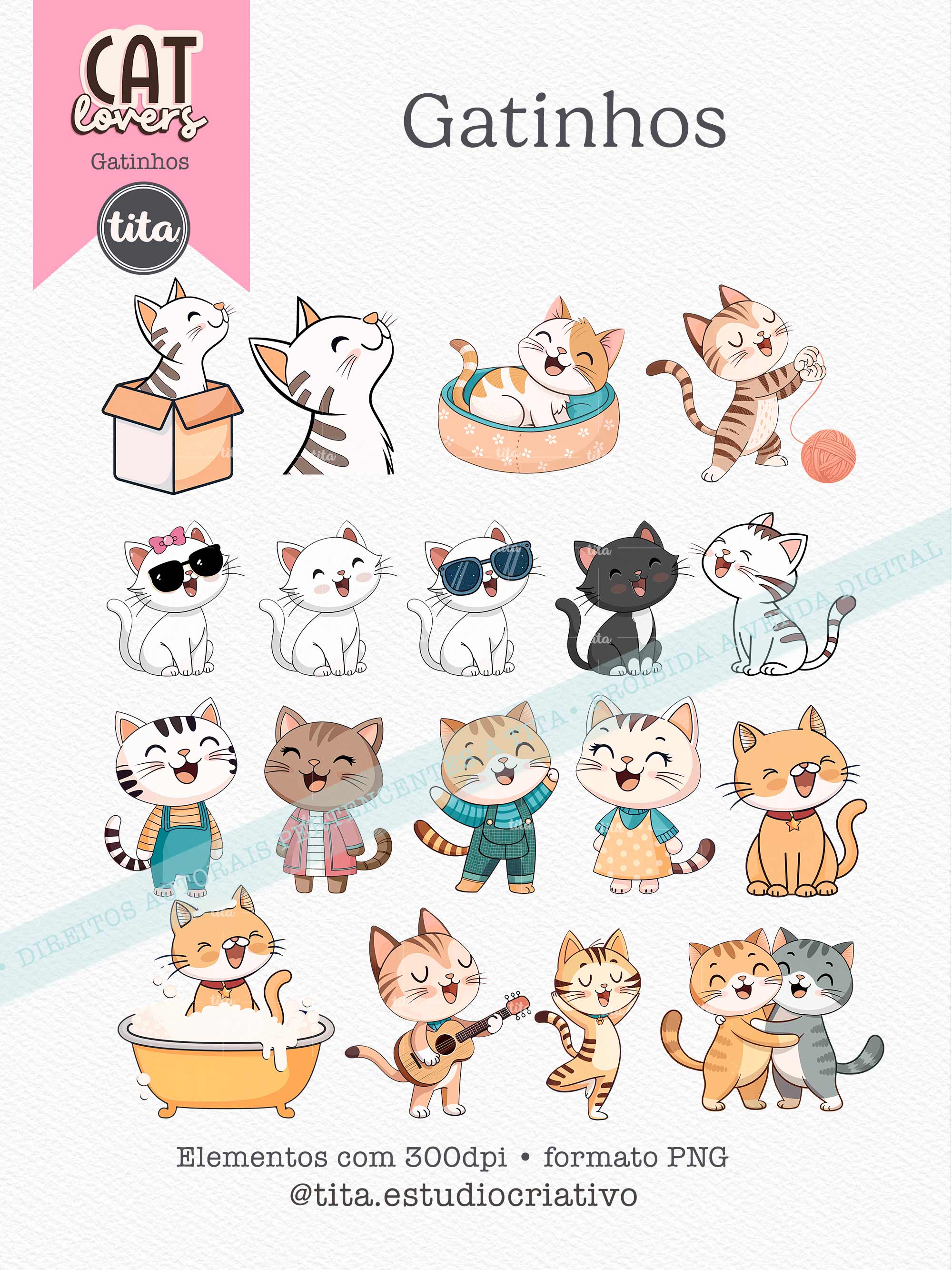 Pacote Gatos com: Gatinhos, Elementos, Letreiros, Buttons, Papéis Decor e Papéis Rapport