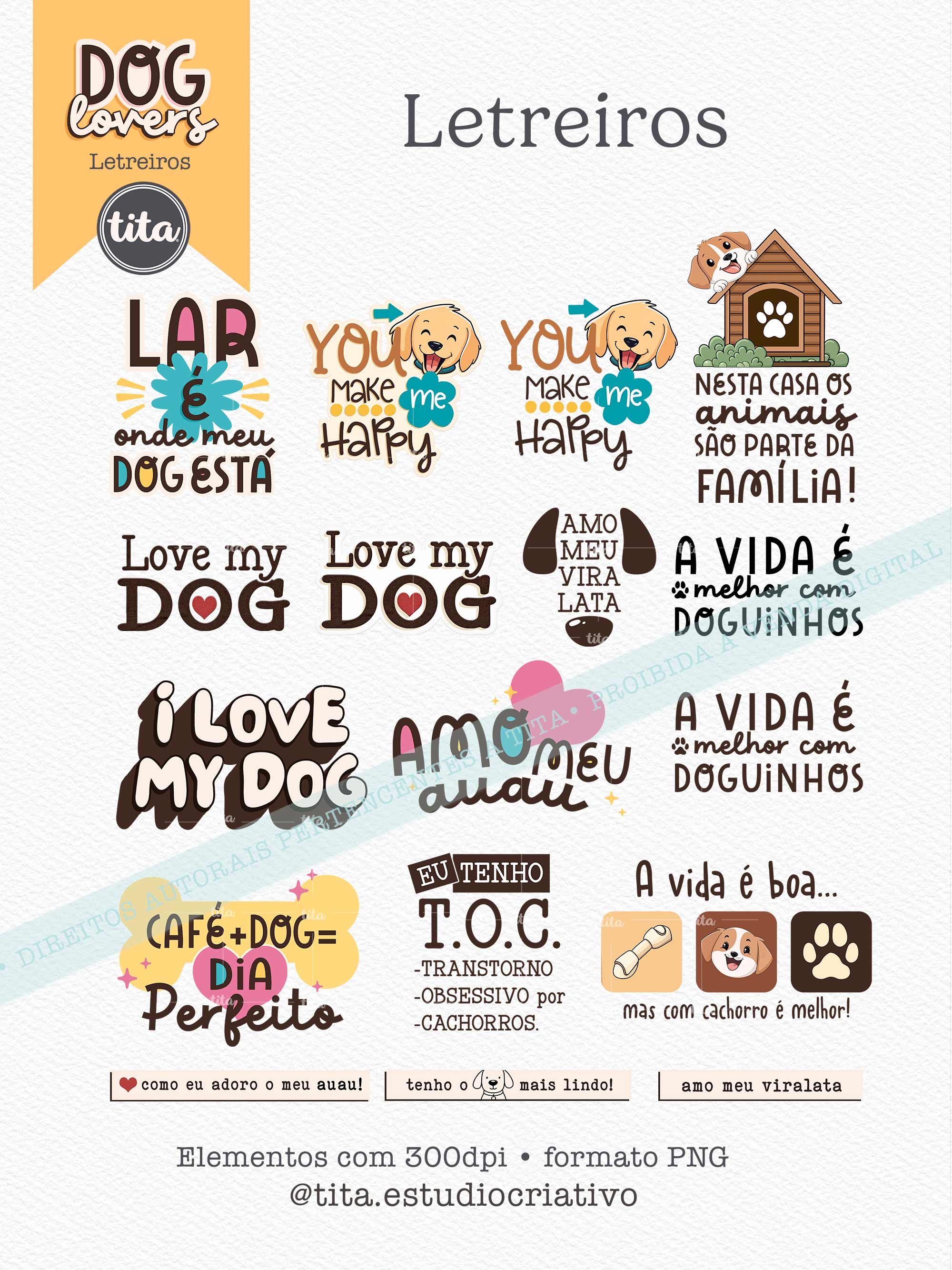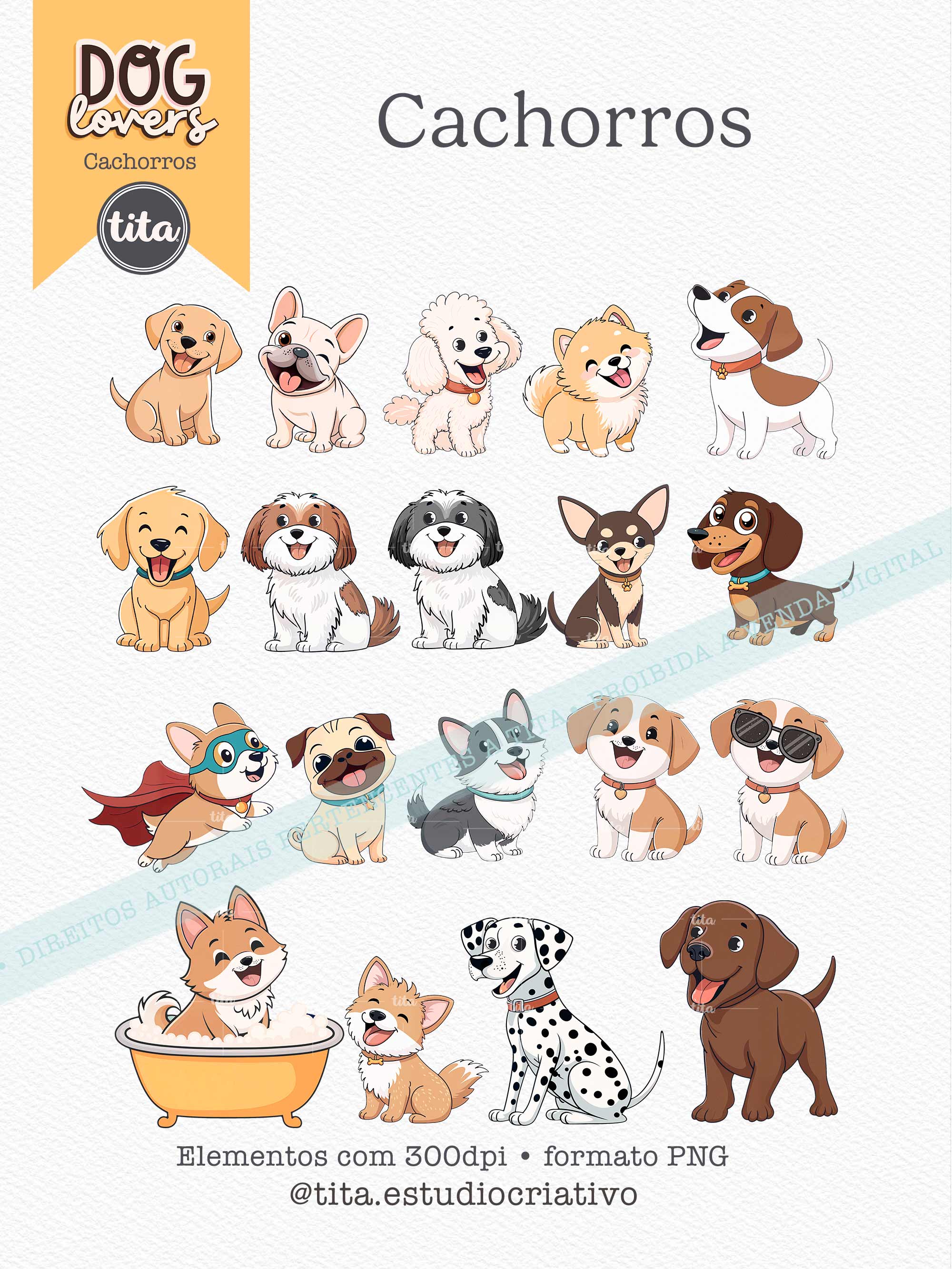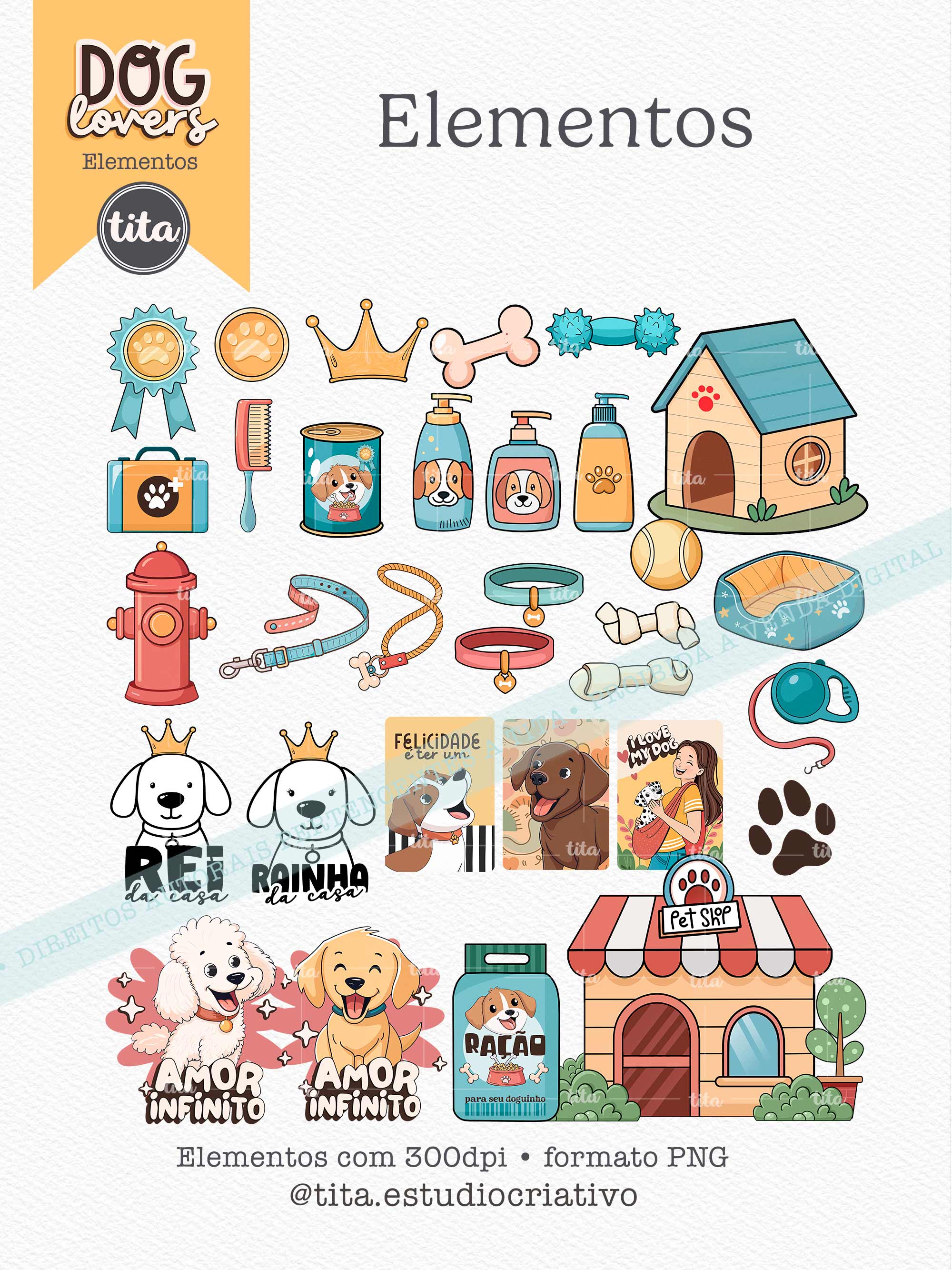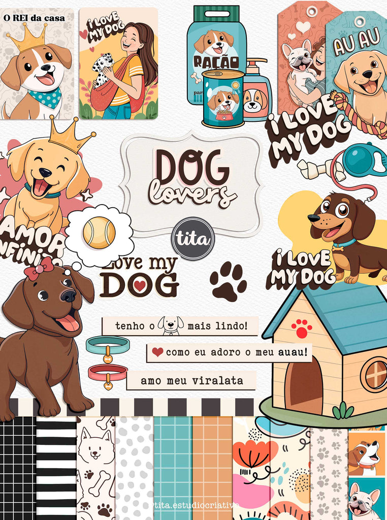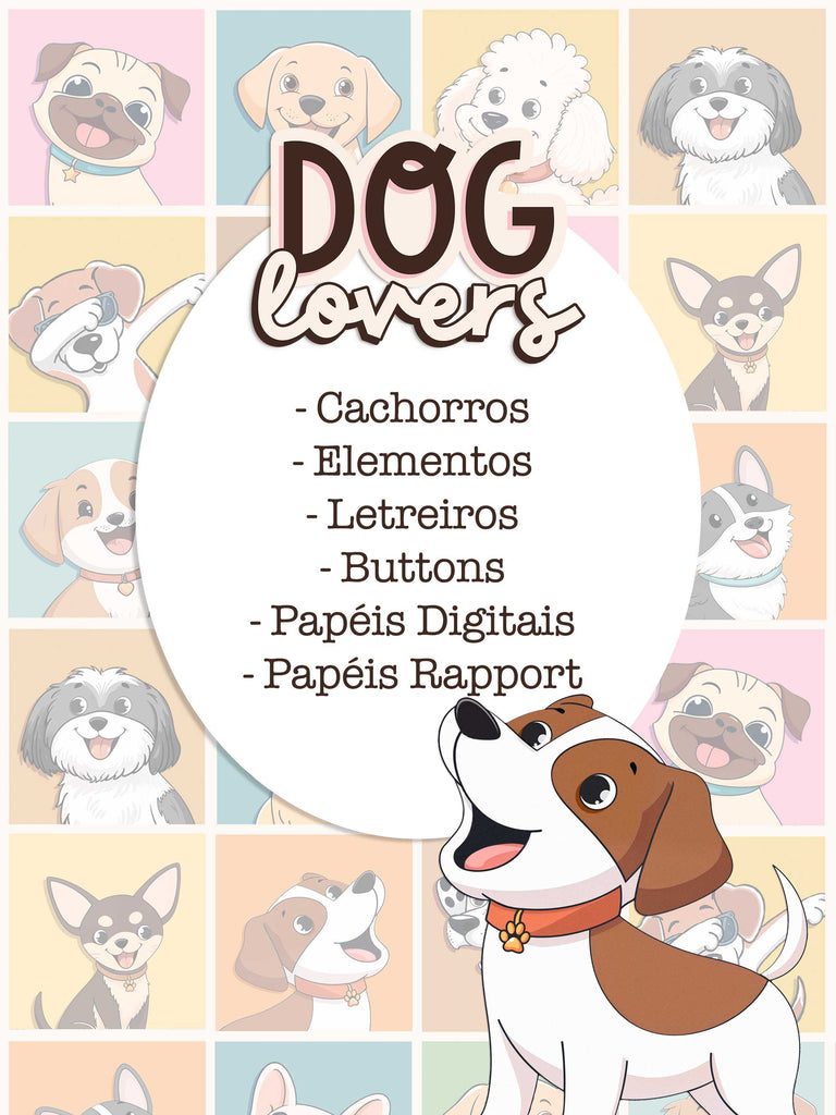 Pacote Cachorro com: Cachorros, Elementos, Letreiros, Buttons, Papéis Decor e Papéis Rapport